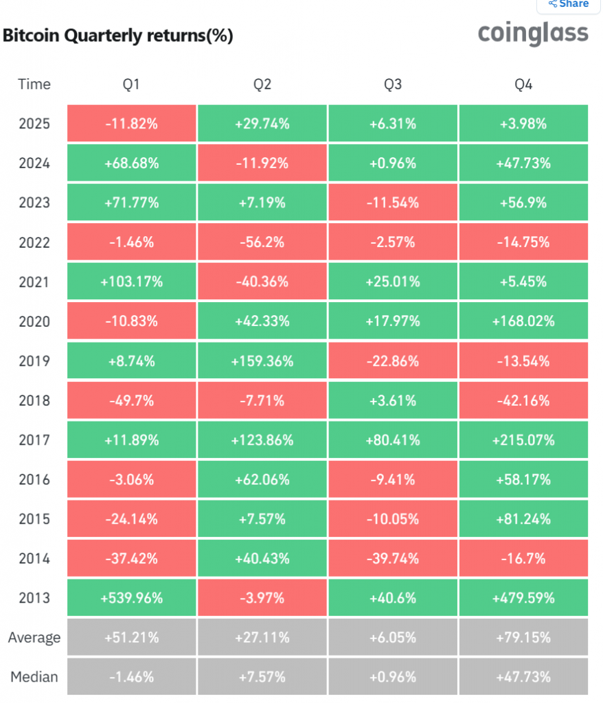Q4 mit einer durchschnittlichen Steigerung von 79,15 Prozent klar am besten, Quelle: https://www.coinglass.com/today