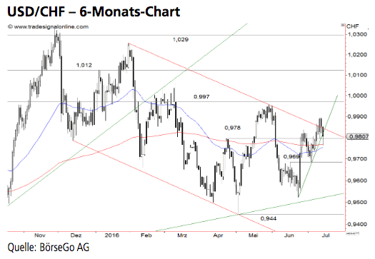 Der Fehlausbruch der Vortage über den bei 0,95 CHF liegenden Abwärtstrend kann kurzfristig bearish bewertet werden. Es bietet sich aber oberhalb des langfristigen Aufwärtstrends die Chance, die laufende Zwischenkorrektur bald zu beenden. Die Long-Szenarien: Ein baldiger Anstieg über die 0,990 CHF-Marke ist nötig, um ein erstes kleines Kaufsignal zu generieren, welches einen Anstieg bis zur 0,997 CHF-Marke nach sich ziehen könnte. Dieses Niveau stellt für die Bullen eine mittelfristig wichtige Hürde dar. Gelingt der Ausbruch über 0,997 CHF-Marke und damit auch über den mittelfristigen Korrekturtrend nach oben, könnten die Verlaufshochs wieder erreicht werden. Im Falle eines dynamischen Anstieges bis zur 1,029 CHF-Marke wäre es auch möglich, diese nachhaltig zu überwinden. Die Short-Szenarien: Sollten sich Anschlussverkäufe zeigen, welche das Währungspaar unter die 0,969 CHF-Marke führen, wird zunächst der Weg zum massgebenden Aufwärtstrend frei, welcher derzeit bei 0,952 CHF eine Unterstützung bildet. Nachdem die Käuferseite den Wert nicht aus dem Korrekturtrend nach oben führen konnte, müsste in diesem Fall einkalkuliert werden, dass der Aufwärtstrend bei 0,952 CHF nicht dauerhaft gehalten werden kann. Ein Rückfall unter die 0,944 CHF-Marke würde schliesslich neue Verkaufssignale generieren, welche auch bis zur 0,904 CHF-Marke führen könnten.