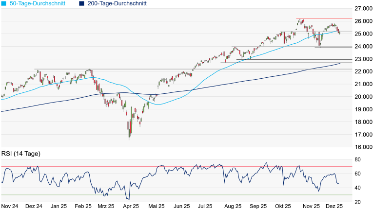 bei 25.835 Punkten noch einmal angesteuert werden. Geht es hingegen weiter abwärts, wäre auf der Unterseite zunächst noch Platz bis zum August-Hoch bei 23.969 Punkten, ehe das jüngste Korrekturtief bei 23.854 Punkten wieder in den Fokus rücken könnte.