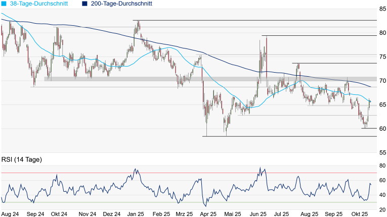 Charttechnik: Der Brent-Preis hat erst am Montag bei 60,07 US-Dollar ein neues 5-Monats-Tief erreicht. In den vergangenen beiden Tagen ging es jedoch wieder kräftig aufwärts. Dabei wurde auch der aktuell bei 65,62 Dollar verlaufende 38-Tage-Durchschnitt überquert - im Hoch kletterte der Brent-Preis bis auf 66,36 Dollar nach oben. Ein Waffenstillstand zwischen Russland und der Ukraine scheint wieder in weite Ferne gerückt zu sein, was die Ölpreise grundsätzlich unterstützen sollte. Auch die neuen Sanktionen gegen Russland und möglicherweise auch Indien dürften die Ölpreise kurzfristig unterstützen. Doch ob dies die Ölpreise nachhaltig anschieben wird, ist ungewiss, zumal die USA alles andere als steigende Ölpreise gebrauchen können, da sie die Inflation weiter befeuern würden. Was US-Präsident Donald Trump mehr will als alles andere, sind fallende Zinsen. Mit einer kräftig anziehenden Inflation wäre dies jedoch eher unwahrscheinlich. Die charttechnische Situation könnte sich mit dem Überqueren der aktuell bei 68,71 Dollar verlaufenden 200-Tage-Jedoch deutlich aufhellen. Auf der Unterseite scheint die Talfahrt fürs Erste jedoch gestoppt zu sein.