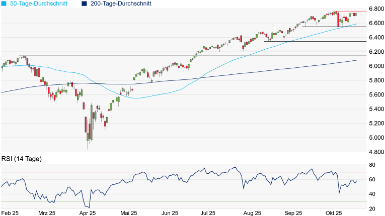 Charttechnik: Der S&P 500 musste zuletzt immer wieder leichte Rückschläge hinnehmen, doch findet er bisher stets schnell zurück in die Spur und notiert somit weiter im Dunstkreis seines Rekordhochs vom 9. Oktober bei 6.765 Punkten. Gestern ging es im Tageshoch bis auf 6.750 Punkte aufwärts, womit das Rekordhoch gerade einmal noch 15 Punkte entfernt war. Die Bilanzsaison verläuft bisher besser als von vielen erwartet - trotz der hohen Erwartungen konnten die meisten Unternehmen bisher überzeugen. Doch der Höhepunkt der Bilanzsaison steht erst noch bevor, wenn mit Alphabet, Amazon, Appel, Meta und Microsoft in der kommenden Woche gleich fünf der sogenannten "Magnificent 7" ihre Bücher öffnen. Immerhin repräsentieren diese fünf Unternehmen mehr als 25 Prozent der gesamten Marktkapitalisierung des S&P 500. Können auch diese Unternehmen überzeugen, dürfte der Höhenflug des S&P 500 seine Fortsetzung finden. Die Deutsche Bank hat ihr Jahresend-Kursziel für den S&P 500 erst vor wenigen Tagen von 6.550 auf 7.000 Punkte angehoben. Allerdings liegt auch ein gewisses Enttäuschungspotenzial vor. Eine erste wichtige Unterstützung taucht am aktuell bei 6.589 Punkten verlaufenden 50-Tage-Durchschnitt auf, ehe das Zwischentief vom 10. Oktober bei 6.551 Punkten in den Fokus rücken würde. Geht es weiter abwärts, könnte es etwas ungemütlicher werden.