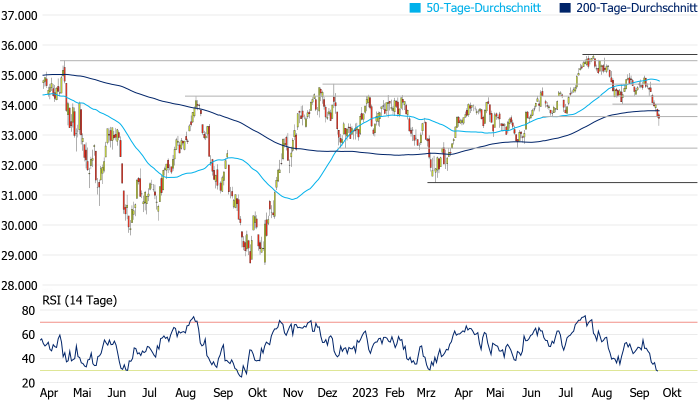 bei 32.587 Punkten auf. Es liegt jedoch bereits eine überverkaufte Marktphase vor, was Hoffnungen auf eine Gegenbewegung macht. Wird die 200-Tage-Linie zurückerobert, würde sich kurzfristig weiteres Erholungspotenzial bis zum August-Tief bei 34.029 Punkten eröffnen.