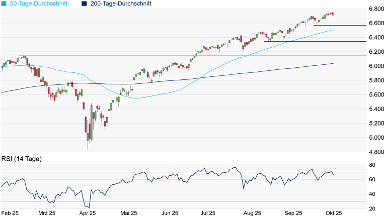 Supportbereich könnte am Hoch vom 23. September bei 6.700 Punkten warten. Halt könnte der S&P 500 danach am jüngsten Verlaufstief vom 25. September bei 6.569 Punkten finden. Die erste wirklich signifikante Unterstützung dürfte aber wohl erst am aktuell bei 6.510 Punkten verlaufenden 50-Tage-Durchschnitt auftauchen.