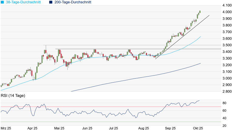 kommen. Immerhin steuert der Goldpreis mit einem Zuwachs von aktuell mehr als 53 Prozent seit Jahresanfang auf sein bestes Jahresergebnis seit 1979 zu. Die jüngste Aufwärtsbewegung verlief jedoch überaus steil, weshalb nur wenige Unterstützungsbereiche gebildet wurden. Halt könnte der Goldpreis bei etwa 3.860 Dollar finden, wo aktuell der seit Mitte August etablierte Aufwärtstrend verläuft. Als Haltezonen könnten sich danach jüngere Drehpunkte erweisen, wie etwa das Zwischentief vom 24.