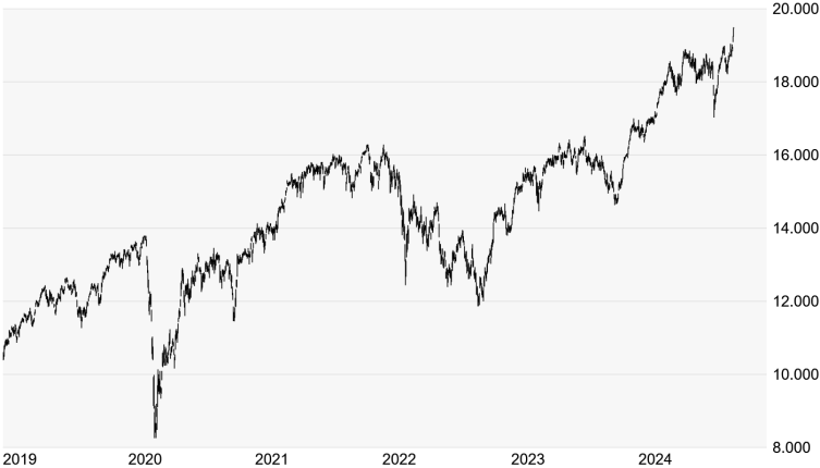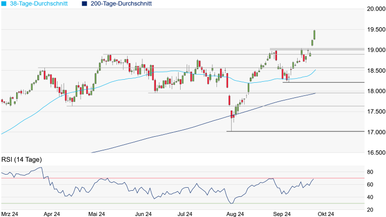 Quelle: Bloomberg. Bitte beachten Sie, dass aus der Wertentwicklung in der Vergangenheit nicht auf die zukünftige Wertentwicklung geschlossen werden kann. | | Charttechnik: Der DAX hat in der zurückliegenden Woche aufs Gaspedal gedrückt und ist um weitere 754 Punkte oder 4,03 Prozent auf weit über 19.000 Punkte geklettert. Bis zum Erreichen der Marke von 19.500 Punkten fehlten dem deutschen Leitindex am Freitag gerade einmal rund 8 Punkte - die neue Rekordmarke liegt somit bei 19.492 Punkten. Geht es nach der Meinung einiger Experten, dann muss die Aufwärtsrally noch nicht beendet sein - die runde 20.000er-Marke wurde auf dem Frankfurter Parkett immer