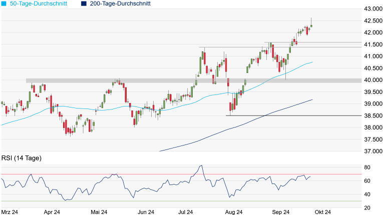 durchaus noch einmal bis auf 41.585 Punkte abwärts gehen, wo mit dem Hoch vom 30. August die erste Unterstützung auftaucht. Mit dem Juli-Hoch bei 41.376 Punkten würde sich recht früh eine weitere Unterstützung in den Weg stellen. Wird auch diese unterschritten, könnte es wieder etwas ungemütlicher werden. Danach müsste die aktuell bei 40.758 Punkten verlaufenden 50-Tage-Linie für Halt sorgen.