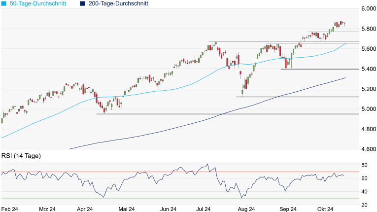 anhalten. Die nächste Zielmarke dürften die Bullen bei 6.000 Punkten gesetzt haben. Doch irgendwann reisst auch die schönste und längste Serie. Fällt die Berichtssaison enttäuschend aus, könnte der Höhenflug gestoppt werden. Eine erste Unterstützung taucht am Zwischenhoch vom 26. September bei 5.767 Punkten auf. Deutlich massiver dürften allerdings die Hochpunkte vom Juli bei 5.670 Punkten und vom August bei 5.652 Punkten sein.