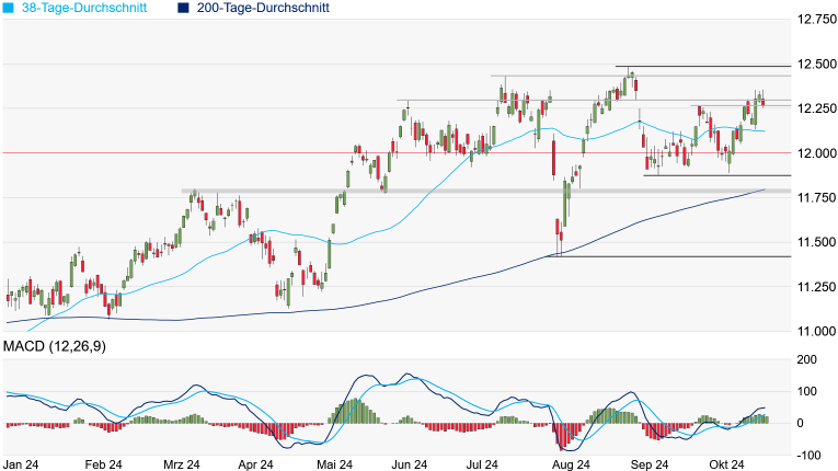 Quelle: Bloomberg. Bitte beachten Sie, dass aus der Wertentwicklung in der Vergangenheit nicht auf die zukünftige Wertentwicklung geschlossen werden kann. | | Charttechnik: Das kurzfristige Chartbild hat sich gestern mit dem Unterschreiten des Juni-Hochs bei 12.295 Punkten und des Zwischenhochs vom 26. September bei 12.268 Punkten wieder leicht eingetrübt. Geht es heute allerdings erneut darüber, wäre die vielversprechende Chart-Situation wieder hergestellt. Danach wäre zunächst Platz bis zum Juli-Hoch bei 12.434 Punkten, ehe das August bei 12.484 Punkten, das zugleich das Jahreshoch markiert, in den Fokus rücken könnte. Mit dem gestrigen Rücksetzer hat
