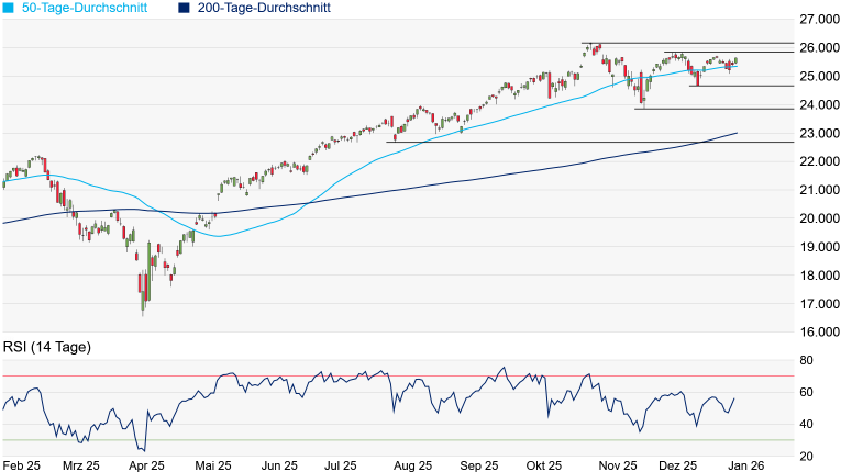 eintrüben, wenn die aktuell bei 25.347 Punkten verlaufende 50-Tage-Linie unterschritten wird. Wichtige Unterstützungen würden danach am Dezember-Tief bei 24.648 Punkten und am November-Tief bei 23.854 Punkten auftauchen.