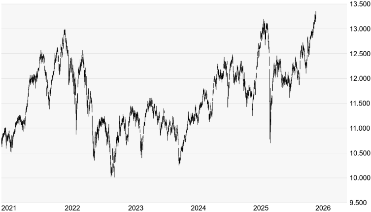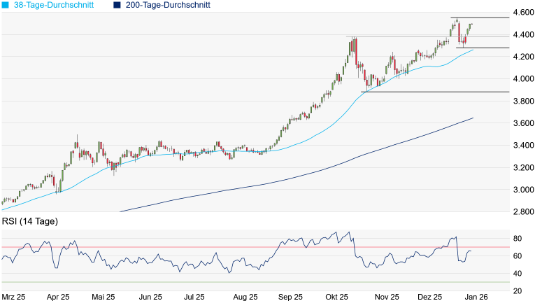 Quelle: Bloomberg. Bitte beachten Sie, dass aus der Wertentwicklung in der Vergangenheit nicht auf die zukünftige Wertentwicklung geschlossen werden kann. | | Charttechnik: Nach der jüngsten Konsolidierung nimmt der Goldpreis wieder Kurs auf sein erst am 26. Dezember erreichtes Rekordhoch bei 4.550 US-Dollar. In der Früh ging es kurzzeitig exakt bis auf 4.500 Dollar aufwärts. Wohin die Reise noch gehen kann, ist schwer zu sagen, doch spricht derzeit angesichts der vielen geopolitischen Krisen wenig für stark nachgebende Goldnotierungen. Wird das Dezember-Hoch überquert, könnte die Rally durchaus an Dynamik gewinnen. Allerdings ist es zuletzt doch deutlich