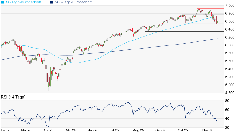 einsetzte. In der letzten Handelsstunde setzten dann zwar noch Gewinnmitnahmen ein, doch verabschiedete sich der S&P 500 wieder deutlich oberhalb des Oktober-Tiefs ins Wochenende, womit sich die Situation wieder entspannte. Merklich zunehmen dürfte das Kaufinteresse aber wohl erst wieder oberhalb der aktuell bei 6.711 Punkten verlaufenden 50-Tage-Linie. Wird auch das Zwischenhoch vom 9. Oktober bei 6.765 Punkten überquert, dürfte der Traum vom Erreichen der 7.000er-Marke wieder etwas