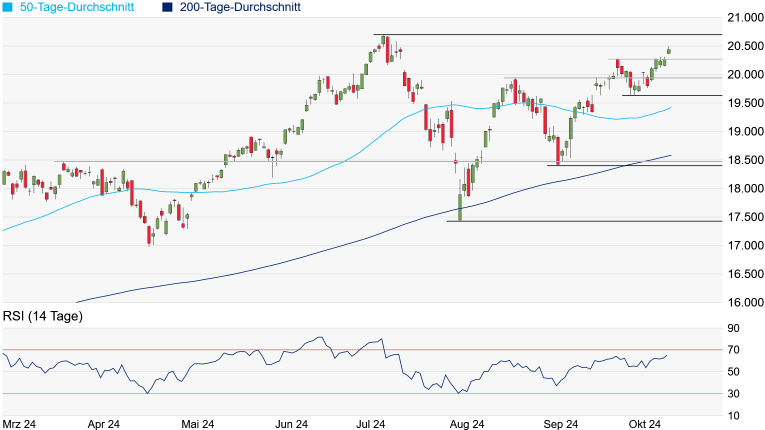 notiert fast 10.000 Punkte oder mehr als 25 Prozent unterhalb seines Rekordhochs aus dem Jahr 2021. Die überwiegend im Ausland tätigen DAX-Unternehmen stört die Schwäche der eigenen Wirtschaft kaum. Die Luft nach oben erscheint angesichts der schwächelnden Autokonzerne und der weiterhin in der Talsohle steckenden Chemieunternehmen begrenzt. Die 20.000-Punkte-Marke dürften die Bullen jedoch weiter fest im Blick haben. Dennoch kann es jederzeit zu Gewinnmitnahmen kommen. Der erste massive