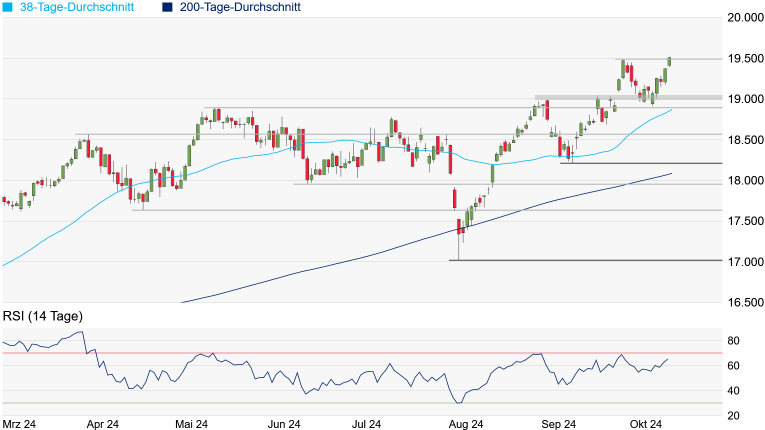 stellen. Auf der Unterseite würde sich die kurzfristige Situation wohl erst wieder bei einem Unterschreiten des jüngsten Verlaufstiefs vom 1. Oktober bei 19.622 Punkten etwas gravierender eintrüben. Zuvor würden sich jedoch noch das gestern überquerte September-Hoch, die 20.000er-Marke und das August-Hoch bei 19.939 Punkten in den Weg stellen.