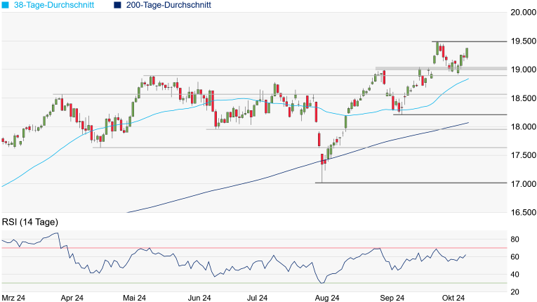 Quelle: Bloomberg. Bitte beachten Sie, dass aus der Wertentwicklung in der Vergangenheit nicht auf die zukünftige Wertentwicklung geschlossen werden kann. | | Charttechnik: Der DAX hat sich am Freitag weiter nach oben geschoben und den Abstand zu seinem Rekordhoch vom September bei 19.492 Punkten auf 118 Punkte verkürzt. Für die heute beginnende neue Handelswoche erscheint somit vieles möglich. Die Herausnahme des Hochs würde ein neues Kaufsignal generieren - das nächste Ziel könnte dann die runde und psychologisch interessante 20.000er-Marke sein. Allerdings müssten dafür auch die schwergewichtigen Autowerte mitspielen, die zuletzt den einen oder anderen