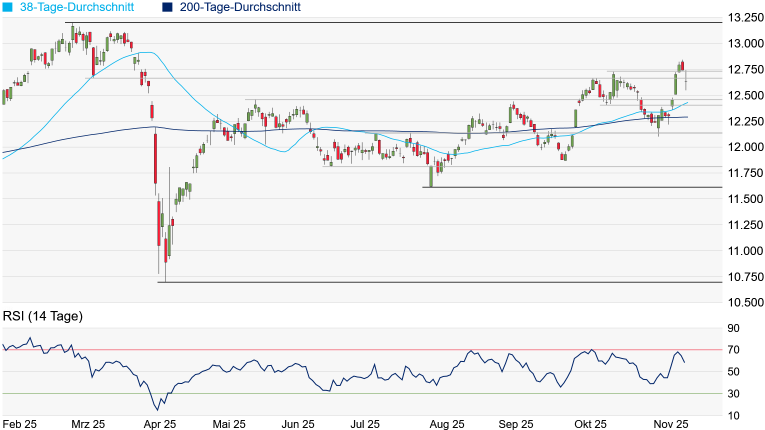 14. Oktober bei 12.403 Punkten würden sich jedoch noch zwei Unterstützungen in den Weg stellen, ehe ein Rücksetzer auf die aktuell bei 12.290 Punkten verlaufende 200-Tage-Linie drohen könnte. Mit den NVIDIA-Zahlen und möglicherweise ersten US-Konjunkturdaten kann sich die Stimmung aber auch jederzeit wieder aufhellen. Kann der SMI sein jüngstes Rally-Hoch bei 12.843 Punkten überqueren, könnte das Zwischenhoch vom 18. März bei 13.117 Punkten wieder in den Fokus rücken. Das Rekordhoch