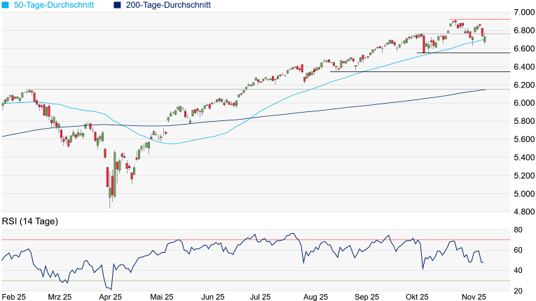 ein, das den Index erneut über den Durchschnitt hievte. Sollte ein weiterer Versuch, den S&P 500 unter den vielbeachteten Durchschnitt zu drücken, mehr Erfolg haben, könnte ein Rücksetzer auf das Zwischentief vom 10. Oktober bei 6.551 Punkten drohen. Ein Unterschreiten würden das kurzfristige Chartbild etwas gravierender eintrüben. Mit den NVIDIA-Zahlen und möglicherweise neuen US-Konjunkturdaten verspricht die neue Woche jedoch spannend zu werden. Findet der S&P 500 zurück in die Spur,