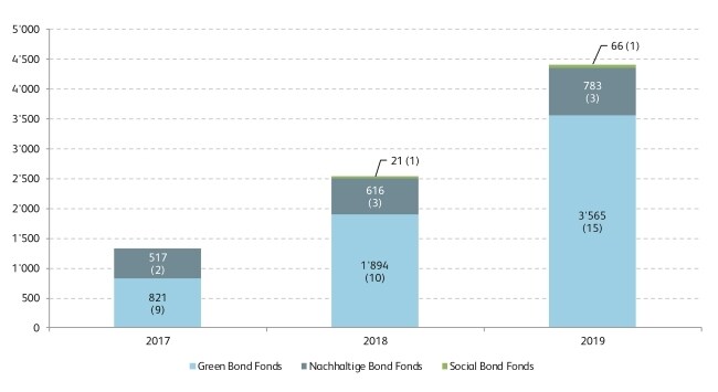 Abbildung 1: Schweizer Publikumsfonds, die in zweckgebundene Themenanleihen investieren (in Mio. CHF, in Klammern Anzahl Fonds, jeweils per 30. Juni, Quelle: IFZ Sustainable Investments Studie 2019)