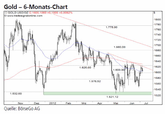 Jetzt informierenAusblick: Die Zuspitzung des Kursverlaufes von Gold nimmt immer dramatischere Züge an und dürfte sich nach unserer Einschätzung in einer enormen Kursbewegung entladen. Die Richtung des entsprechenden Ausbruchs ist derzeit jedoch offen. Die Short-Szenarien: Setzt Gold unter 1.600,00 USD zurück, wäre eine leichte Korrektur bis 1.575,00 USD zu erwarten, doch könnte der Wert von dieser Marke aus einen weiteren Ausbruchsversuch angehen. Fällt das Edelmetall unter 1.575,00 USD zurück, könnte nurmehr die 1.550,00 USD-Marke einen Rückfall auf 1.521,12 USD verhindern. Ein Unterschreiten dieser Marke würde ein langfristiges Verkaufssignal auslösen, das zu einem ersten Einbruch bis 1.476,45 USD führen dürfte. Auf mittlere Sicht sind jedoch Abgaben bis 1.380,00 USD wahrscheinlich. Ein Unterschreiten von 1.521,12 USD könnte man entsprechend „short“ handeln. Die Long-Szenarien: Den gegenteiligen Effekt hätte ein Anstieg über die Hürde bei 1.625,00 USD. Dies dürfte bei einem Folgeanstieg über 1.640,00 USD zu einem Aufwärtsimpuls bis 1.680,00 und 1.725,00 USD führen. Entsprechend könnte man einen Anstieg über 1.640,00 USD mit einem Longengagement handeln. Sollte den Käufern sogar der Ausbruch über 1.725,00 USD gelingen, wäre der Abwärtstrend der letzten Monate überwunden und eine Hausse in Richtung 1.775,00 USD möglich.