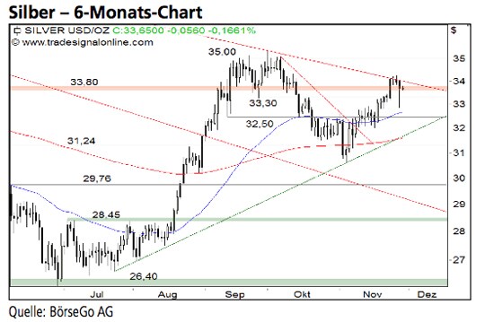 Rückblick: Der Silberpreis korrigierte bis Anfang November die Kaufwelle der Vormonate und bildete knapp unterhalb der Unterstützung bei 31,24 USD...
