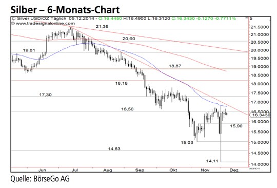 Jetzt informierenAusblick: Den Bullen ist am vergangenen Montag ein gewal - tiger Konter gelungen. Knapp unterhalb der Barriere bei 16,50 USD unternehmen sie aktuell den Versuch, diesen Kaufimpuls fortzusetzen. Die Long-Szenarien: Kurzfristig dürfte der Wert in den kommenden Tagen auf hohem Niveau seitwärts ten - dieren, ehe sich die Aufwärtsbewegung mit einem Anstieg über 16,50 USD fortsetzen dürfte. Ein solcher Ausbruch hätte direkte Zugewinne bis 17,30 USD zur Folge. An dieser Hürde könnte eine stärkere Gegenbewegung einsetzen, die durchaus bis 16,50 USD zurückführen kann. Wird die 17,30 USD-Marke nach Abschluss der Korrektur überwunden, könnte Silber auf mittlere Sicht bereits weiter bis 18,18 und 18,87 USD haus - sieren. Die Short-Szenarien: Sollte der Wert dagegen unter die Haltemarke bei 15,90 USD zurückfallen, käme es zu einer kurzen Abwärtsbewegung bis 15,40 USD, ehe Silber von dort wieder in Richtung der 16,50 USD-Marke steigen sollte. Bricht das Edelmetall dagegen unter diese Haltemarke ein, könnte nur mehr die Unterstützung bei 15,03 USD einen erneuten steilen Einbruch bis 14,11 USD aufhalten.